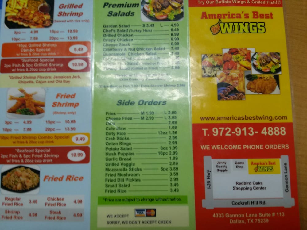 Welcome to America's Best Wings Dallas, where flavor takes center stage! Located at 4333 Gannon Ln #113, Dallas, this culinary gem specializes in mouthwatering cheesesteaks, crispy chicken wings, and fresh seafood. The menu boasts a delightful array of options for every palate, including premium salads like the Catfish Salad and Cranberry & Almond Chicken Salad, each expertly crafted for a satisfying dining experience.